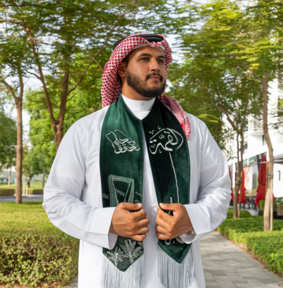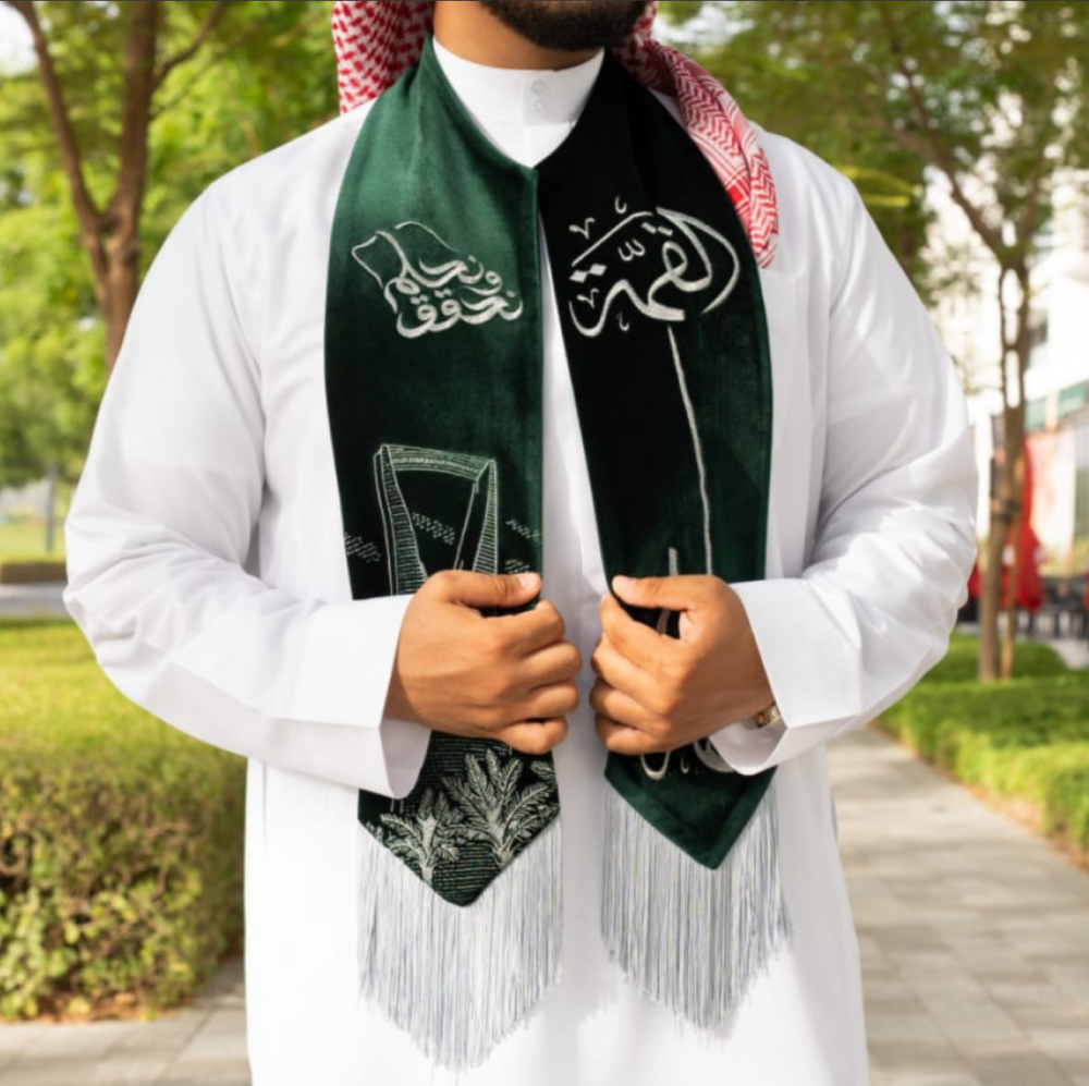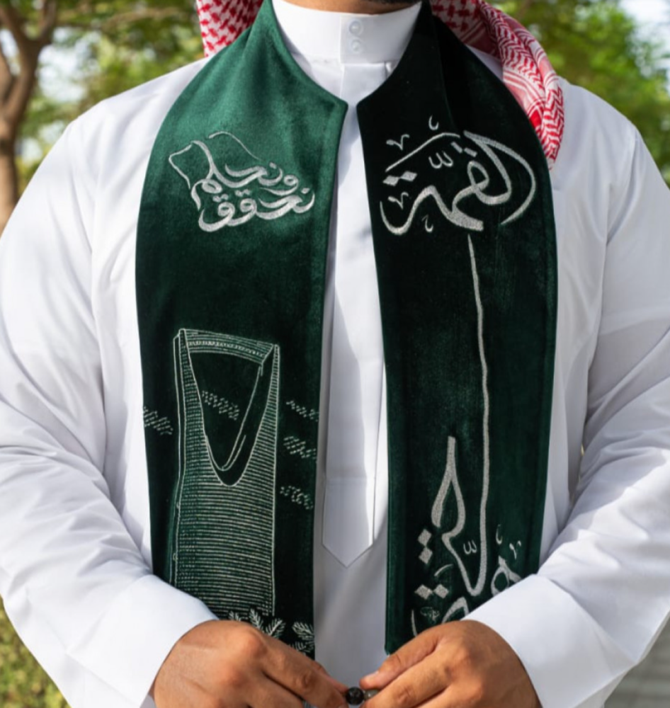 "وشاح اليوم الوطني السعودي المطرز الفاخر يتميز بتصميم فريد يمزج بين التراث العريق والحداثة. مصنوع من أجود أنواع الأقمشة الفاخرة، يتميز بنعومته وراحته عند الارتداء. الوشاح مزين بتطريزات يدوية متقنة، تبرز تفاصيل الشعارات الوطنية مثل السيفين والنخلة بشكل مذهل. الألوان الخضراء والبيضاء تندمج بانسيابية في التصميم، مما يضفي عليه طابعًا مميزًا وأنيقًا. حواف الوشاح محاطة بخيوط ذهبية تضيف لمسة من الفخامة، مما يجعله قطعة مثالية للارتداء في الاحتفالات الوطنية وللتعبير عن الفخر بالوطن."