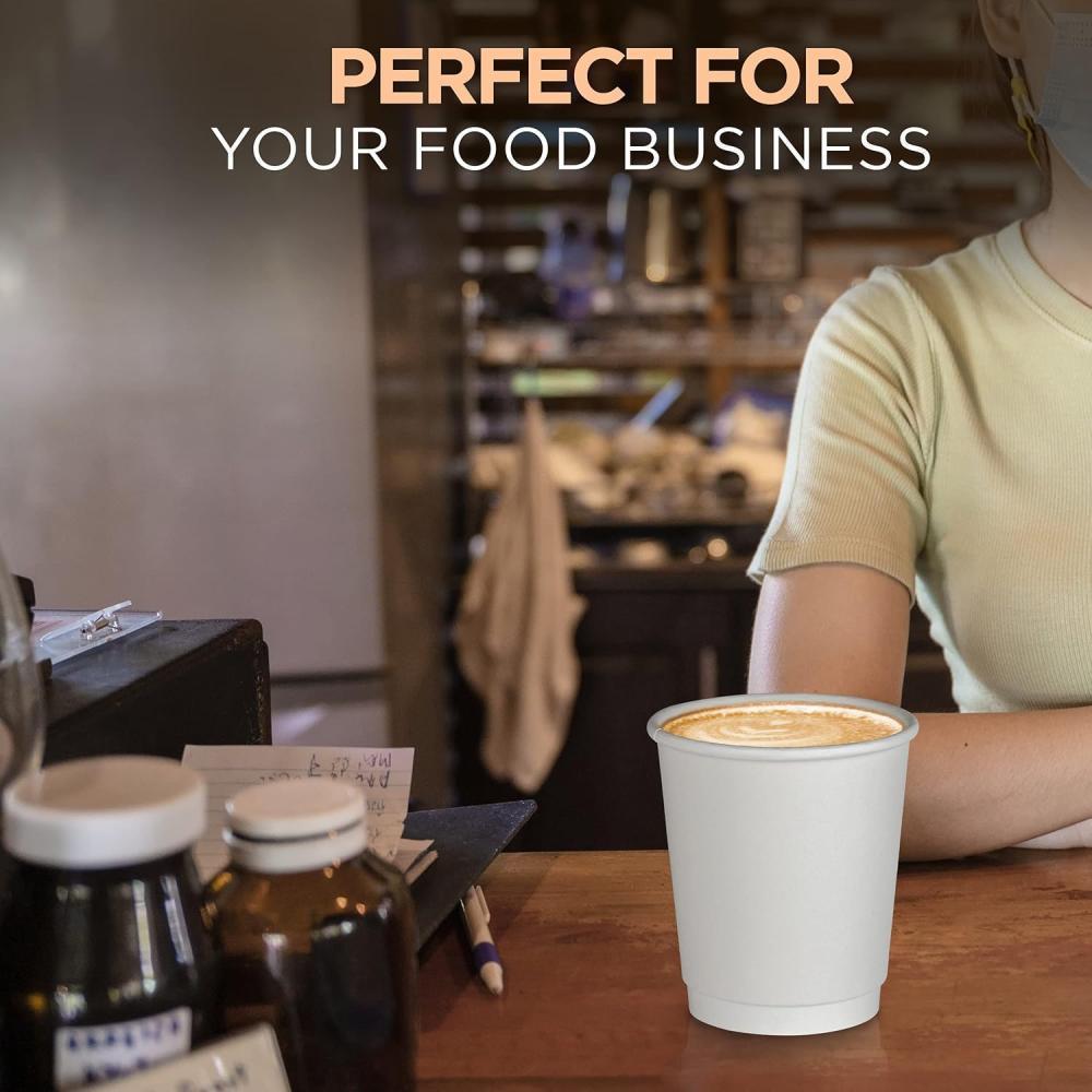 12 oz double wall paper cups, white with lid and stylish design. These cups are ideal for hot and cold beverages, providing excellent thermal insulation. Your company logo can be printed in one color on the cups, making them an ideal choice for promoting your brand at events, conferences, and cafes. The cups are available in quantities of 1000, ensuring that your needs are fully met.