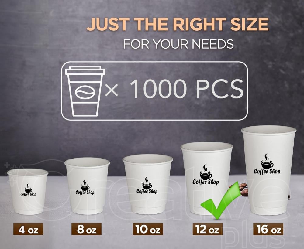 12 oz double wall paper cups, white in color and featuring a stylish design. These cups are ideal for hot and cold beverages, providing excellent thermal insulation. Your company logo can be printed in one color on the cups, making them an ideal choice for promoting your brand at events, conferences, and cafes. The cups are available in quantities of 1000, ensuring that your needs are fully met.